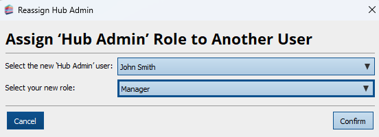 On selecting this link, the current Hub Admin is prompted to select another user who will become the new Hub Admin and is prompted to choose a new role for themselves (as they will no longer be the Hub Admin).