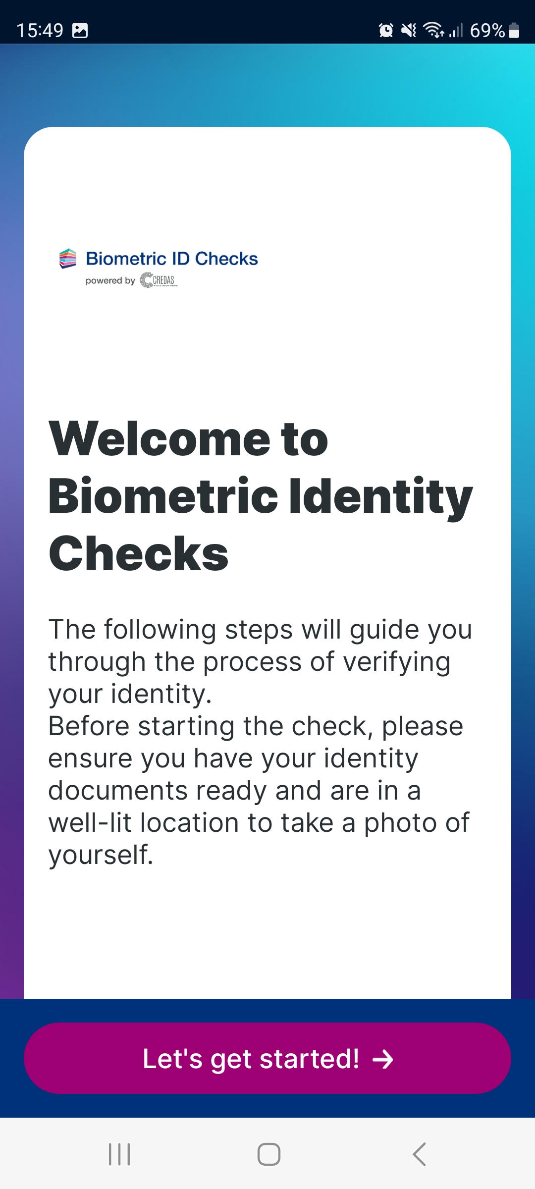 Your client will receive an email/SMS providing them with a link to complete the biometric identity check and a personal registration code. Selecting ‘Start your biometric Identity Check’ will start the check